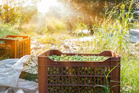 Harvested fresh olives in plastic box in a field, Italian for olive oil production