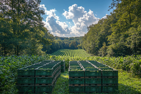 Aerial drone photograph of rows of green fruit crates stacked on top of each other in the foreground, a large orchard with many trees and blue skies overhead, captured with a 300mm lens. --chaos 30 --ar 3:2 --quality 2 --stylize 500 --v 6.1 Job ID: e6f00727-0256-4ec2-9b33-30c127f38289