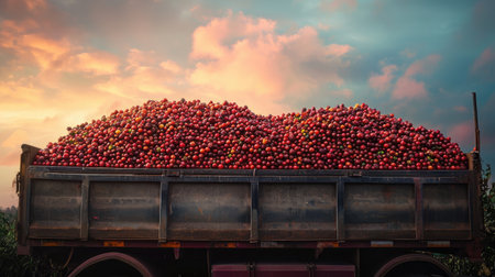 Cargo truck carrying various types of vegetables in a field with sunset. Concept of food transportation, logistics and cargo.