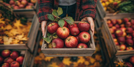 hands holding basket of freshly picked apple, background with golden leaves and crates of autumn produce.