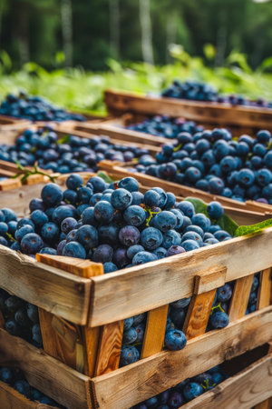 Natures orchestra plays softly in the vineyard a wooden crate holds the melody of the season, a chorus of dark, luscious black grapes.