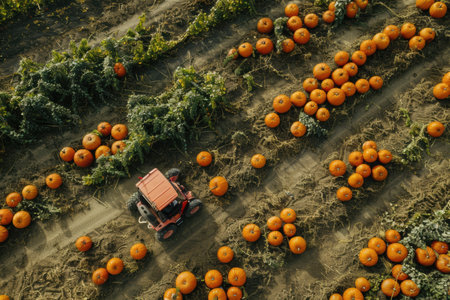 Drone view of a pumpkin farm during harvest, colorful autumn produce spread across fields