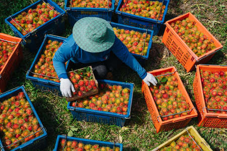 Top view of Asian farmer woman harvesting fresh rambutan in crate at the rambutan garden. Organic fruit agriculture concept.