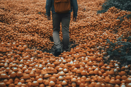 A person walking through mushrooms. Generative AI