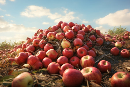 A huge pile of ripe apples in a landfill. The problem of overproduction and irrational consumption.