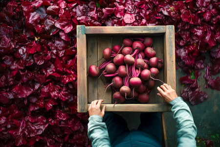 Hands Harvesting Organic Beets in Rustic Farm Wooden Crates