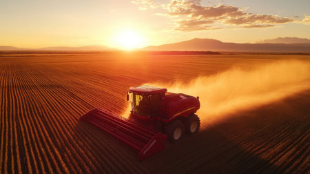 A vibrant agricultural scene showcasing a harvesting machine in action at sunset, creating dust clouds over golden fields, embodying hard work and nature's beauty.
