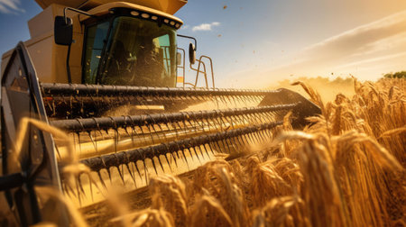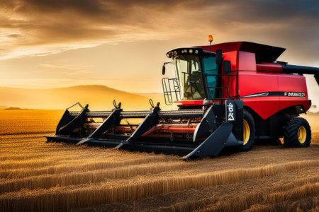 A combine harvester operates in a field of wheat under a dramatic sunset. The agricultural machine is central, showcasing its mechanics and function. Warm colors, including orange and gold, create a visually appealing scene. Ideal for illustrating farming, agriculture, or environmental themes in various media.