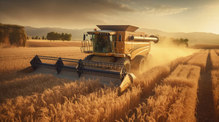 Combine harvester working on a wheat field at sunset. A tractor harvesting wheat starch in the sunset on a country field, AI Generated