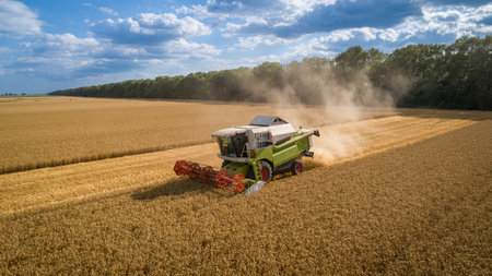 Aerial view on harvesting machinery working on large wheat field. Blue sky. Sun warm day.