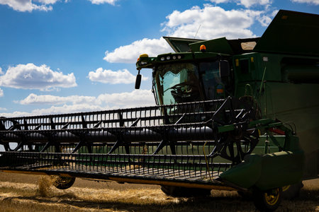 Summer photo of barley harvesting, “Combine Harvester†is a mechanized method that combines the process of harvesting, threshing and winding crops 2019 09 06 Tukaevsky district Tatarstan Russia