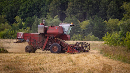 The red and white harvester is harvesting yellow wheat. Harvesting in early autumn on a sunny day.