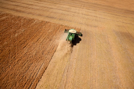 Top central view of an agricultural machine - green combine - working at a fertile land full of ready rapeseed plants. Harvesting season. High quality photo
