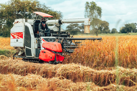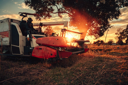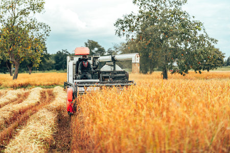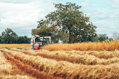 Combine the task of harvesting rice and cutting it in an early morning field in rural farmland.