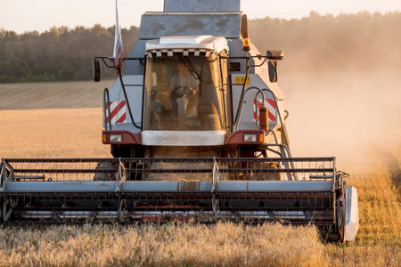 Combine harvester in action on rye field. Process of gathering a ripe crop on the sunset in late summer by agricultural machinery