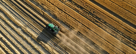 A tractor plows through a golden field at sunset, kicking up clouds of dust. The clear sky and warm light create a serene atmosphere over the countryside, showcasing agricultural activity