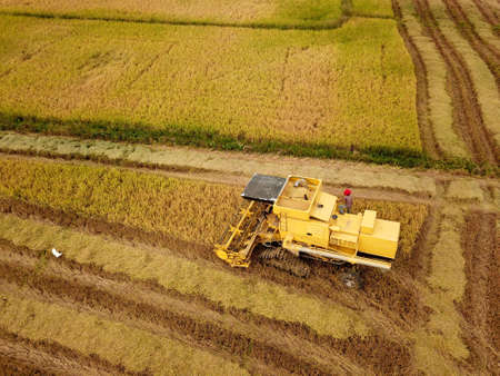 aerial view of a combine harvester ,during harvesting, on asian rice field