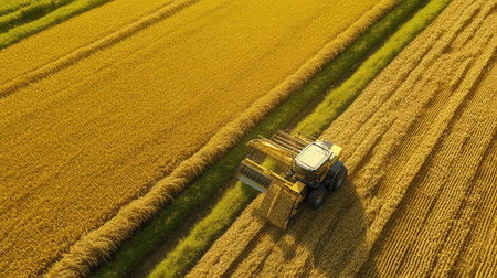 Red tractor is harvesting a golden wheat field, creating lines in the crops