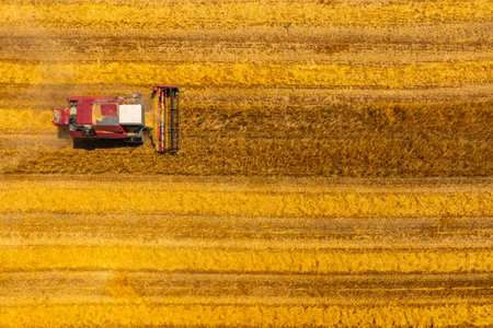 Aerial view of combine harvester working during harvesting season on large ripe wheat field. Agriculture concept