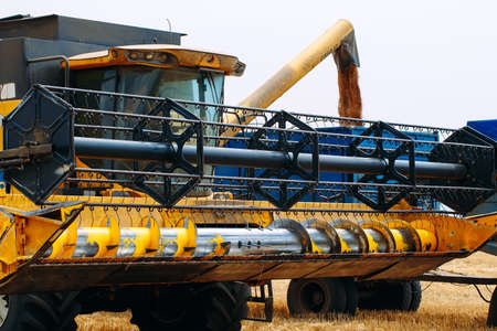 Modern industrial combine harvester harvests wheat cereals on a summer day. Rich harvest concept.