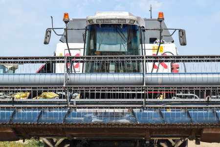 The red and white harvester is harvesting yellow wheat. Harvesting in early autumn on a sunny day.