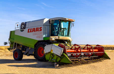 Turegano, Segovia / Spain - October 09, 2016: Combine harvester on the edge of the field.