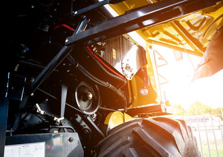 A view of the combines motor. Big powerful industrial combine harvester machine. Engine details. Diesel engine.