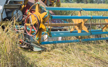 Combine the task of harvesting rice and cutting it in an early morning field in rural farmland.