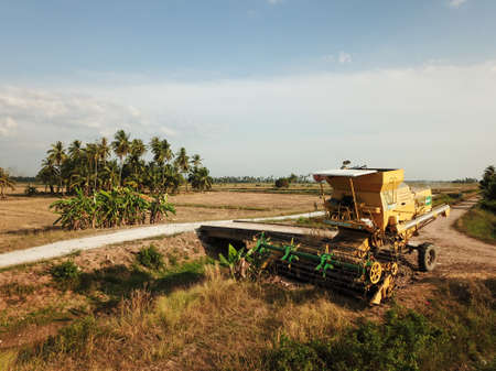 Pulau Ssyak, Kedah/Malaysia - Feb 26 2020: Harvester park in paddy field.
