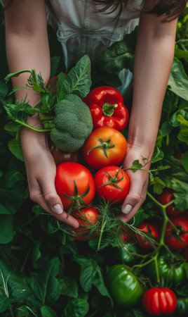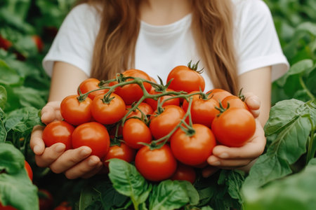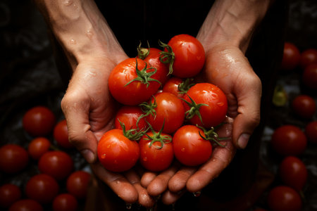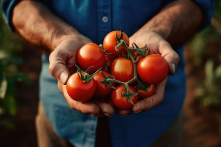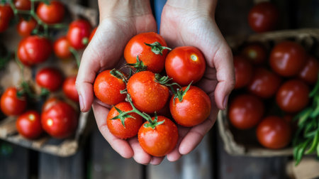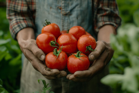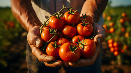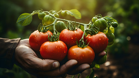 Farmer's hands present freshly picked tomatoes, displaying rich colors and textures, surrounded by lush greenery, representing the essence of organic farming and nature's bounty