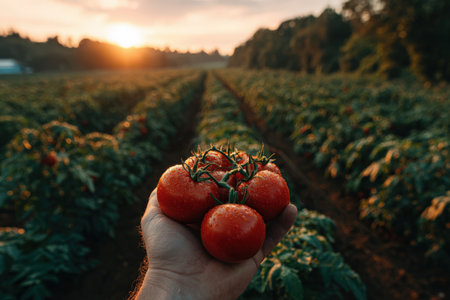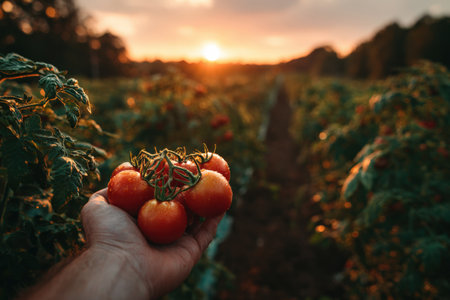 Hand displays ripe tomatoes in a vibrant garden, with green foliage and a glowing sunset in the background, capturing the essence of agricultural abundance and nature's bounty