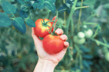 Farmer holding fresh tomatoes at sunset. Food, vegetables, agriculture