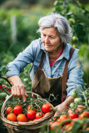 An elderly woman with gray hair, clad in a blue shirt and apron, gently picks ripe tomatoes from a lush garden plant. She is slightly bent over, carefully placing the harvested fruit into a woven basket, surrounded by green foliage in an outdoor setting.