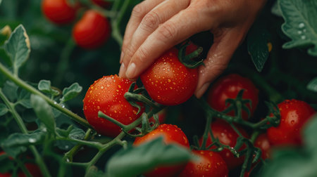 Close up of hand picking red tomatoes from the vine in a greenhouse, showcasing the fresh produce