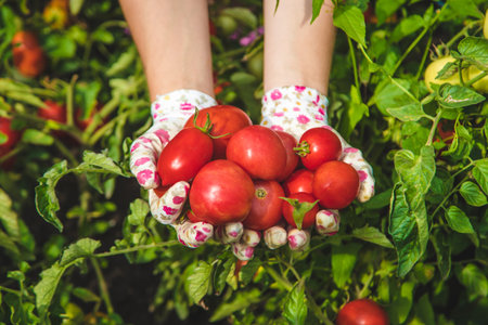 The farmer harvests tomatoes in the garden. selective focus. food.