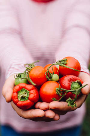 Farmers hands with freshly harvested tomatoes and pepper. Freshly harvested tomatoes in hands. Young girl hand holding organic green natural healthy food produce pepper. Woman holding cherry tomatoes