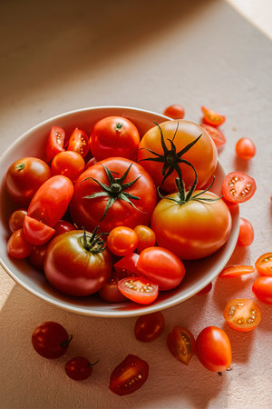 Ripe fresh tomatoes cut and whole in a bowl