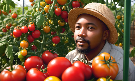 African american man farmer with container harvest of tomatoes in greenhouse. Concept of horticulture, agriculture and organic products. Generative AI