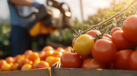 Freshly harvested tomatoes await sorting while a farmer uses a tool in the background during the golden hour