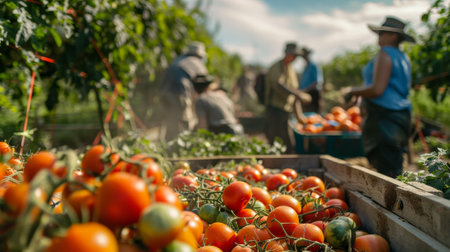 A group of people are picking tomatoes in a field. Scene is lively and energetic, as the workers are actively engaged in their task