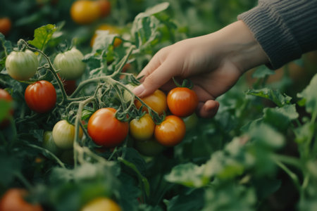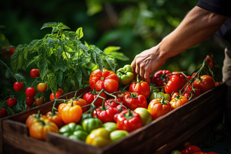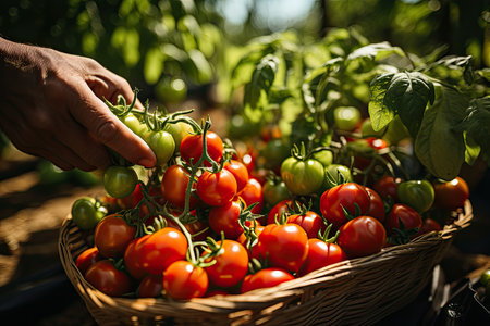Person harvesting ripe tomatoes in sunny garden., generative AI