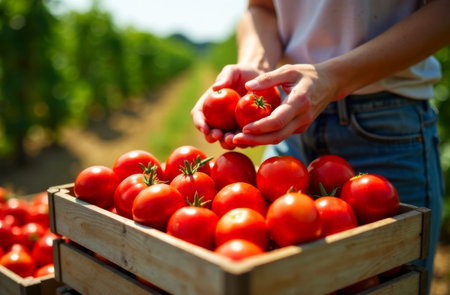 female farmer carefully placing red juicy freshly picked ripe tomatoes into wooden crates for transportation on farm field background, harvest concept, hands close up