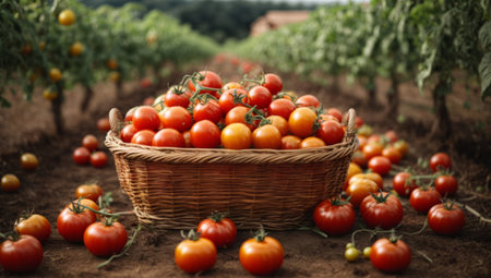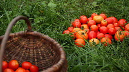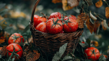 A basket filled with fresh, ripe tomatoes resting on the grass in a vibrant autumn garden. This organic harvest evokes the essence of the season and the joy of homegrown produce.