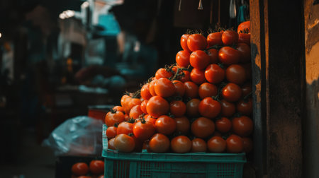 Fresh, ripe tomatoes stacked neatly on a market stall, glowing in natural sunlight, ideal for showcasing organic, farm-fresh produce