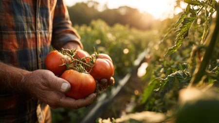 A farmer holds freshly harvested organic tomatoes in his hands, surrounded by a lush garden at sunset, representing the essence of sustainable agriculture.