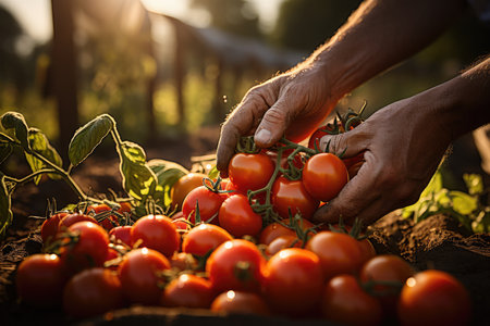 Farmer hands picking fresh tomatoes from the field in sunset light.