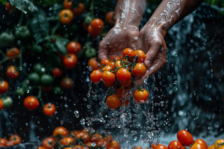 Close-up image showcasing ripe tomatoes cradled in wet hands, with a dark background