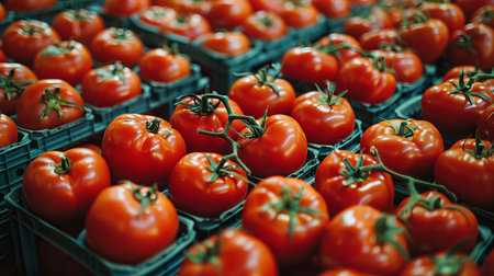 Fresh organic red tomatoes in summer market tray, farm agriculture background for food marketing