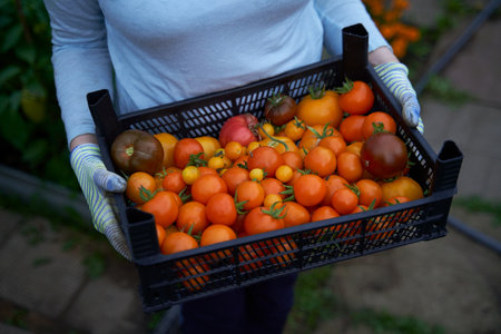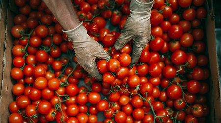 the hands of the farmer carefully put the fresh crop of tomatoes in the basket. Generative AI