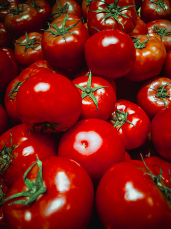 Group of ripe, red tomatoes. Tomatoes are arranged in cluster. Light catches surface of tomatoes, highlighting their vibrant color and glistening texture. They were recently harvested. AI generated.